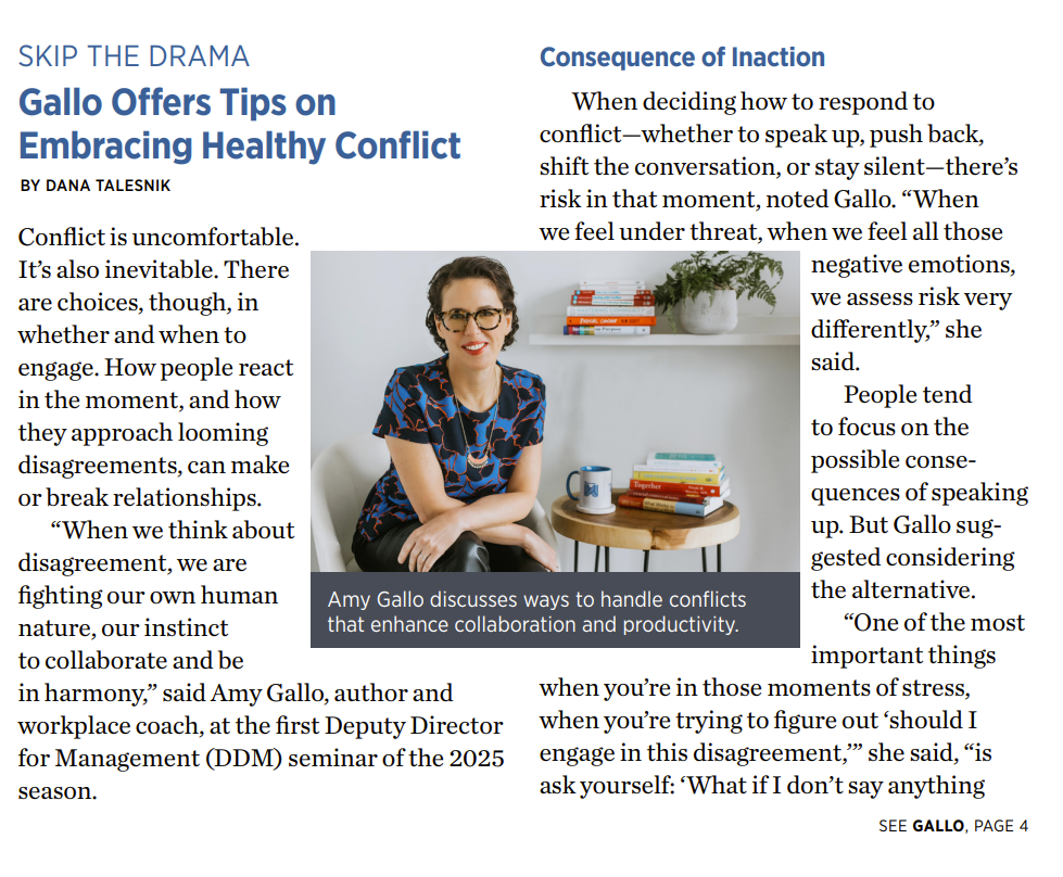 Read the full interview with Amy Gallo’s tips for engaging conflict: Gallo Offers Tips on Embracing Healthy Conflict | NIH Record